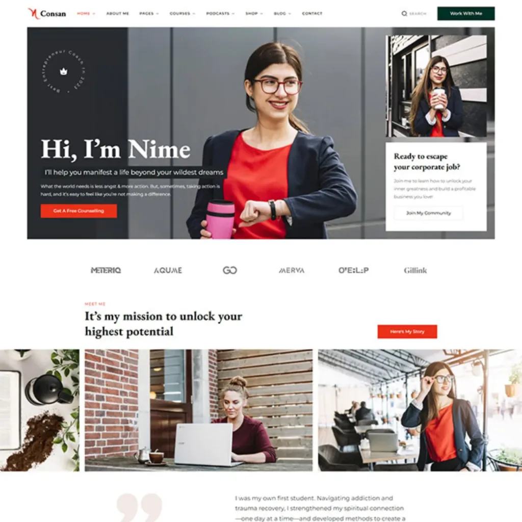 Consan is a modern and responsive Elementor WordPress theme designed for feminine coaching and consulting websites. Perfect for life coaches, business mentors, wellness guides, and women empowerment brands, it comes with multiple demo variations and beautifully crafted inner pages to fit diverse coaching niches.