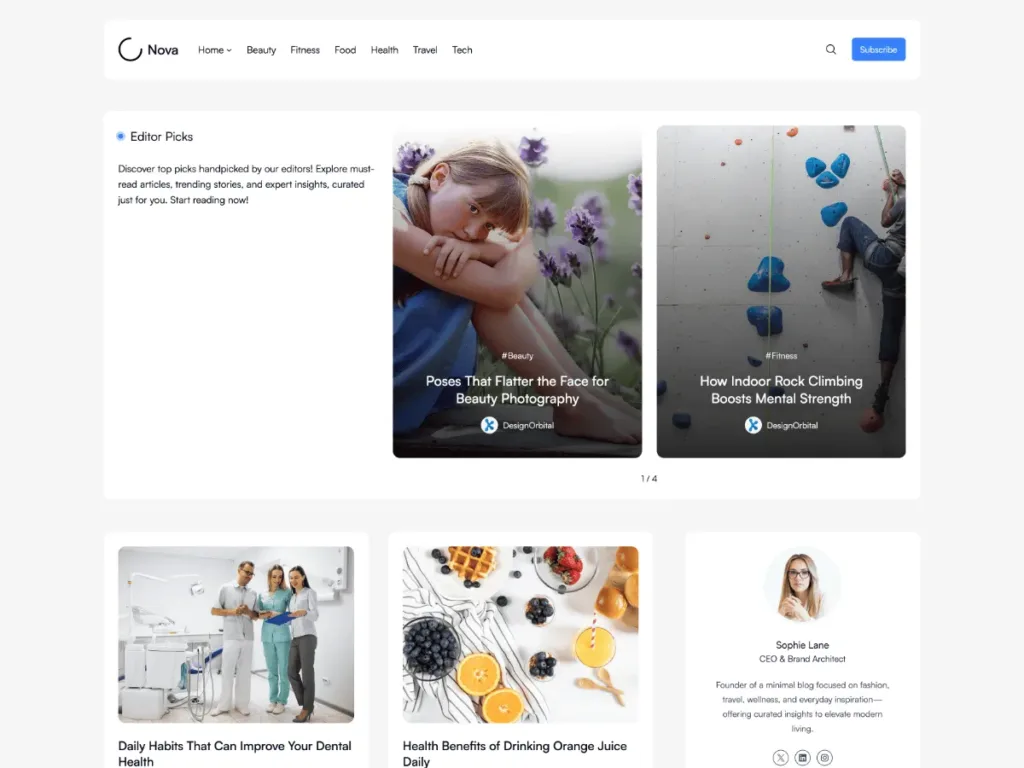 Nova is a free minimal WordPress blog theme created for writers, creators, and publishers who value clarity, simplicity, and elegance. Built with Full Site Editing (FSE) and fully compatible with Gutenberg, it gives users complete control over layouts, templates, and styles—without coding.