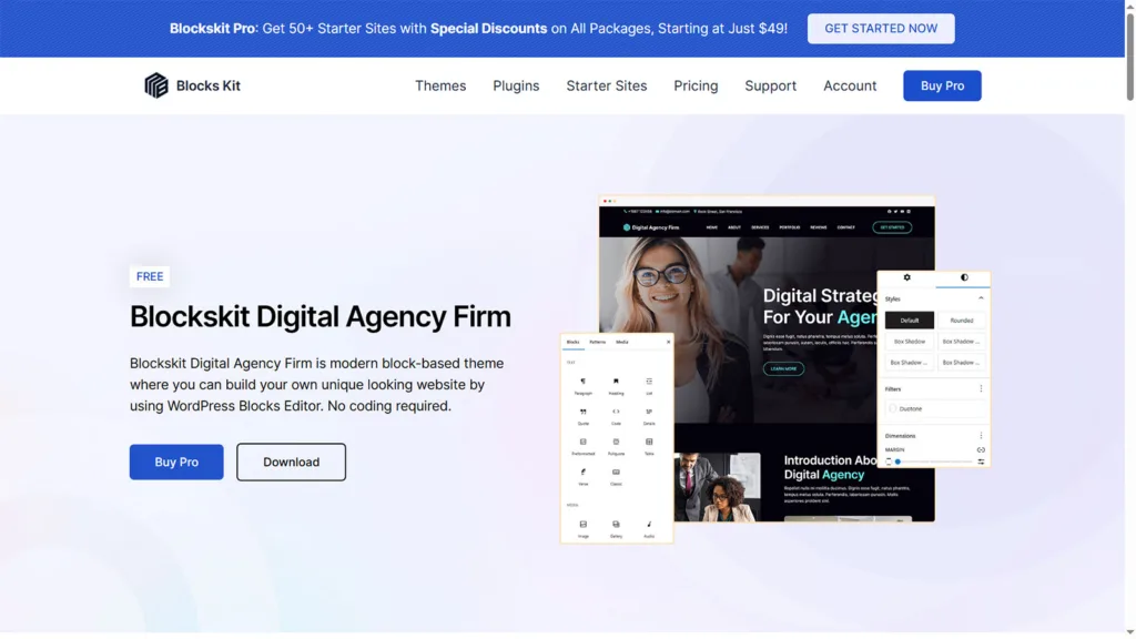 Blockskit Digital Agency Firm is a modern and versatile Full Site Editing (FSE) WordPress theme crafted to meet the diverse needs of businesses and agencies. Whether you run a corporate firm, consulting service, or digital marketing startup, this theme provides a professional foundation to build a strong online presence.
